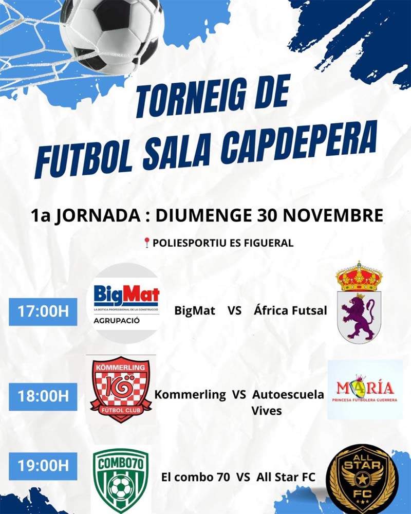 1a jonada del Torneig de futbol sala de Capdepera Data nov. 30 2025 Caducat! Hora 17:00 - 22:00 Comparteix aquest esdeveniment