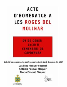 Acte d’homenatge a les Roges del Molinar 2026 00 dies 00 hores 00 minuts 00 segons Data gen. 04 2026 Hora 16:30 - 18:00 Categoria Altres Comparteix aquest esdeveniment