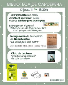 - Inauguració de l’exposició de Nena Mestre “La lletra pels ulls entra”. Llibre d’artista, llibre alterat i poesia visual. Exposició oberta de l’11 de desembre al 20 de gener. Horari d’obertura de la biblioteca.