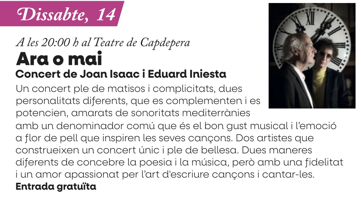 Ara o mai: concert de Joan Isaac i Eduard Iniesta 00 dies 00 hores 00 minuts 00 segons Data març 14 - 15 2026 Hora 20:00 - 22:00 Localització Teatre Municipal de Capdepera Carrer des Col·legi, 18, 07580 Capdepera, Illes Balears Categoria Música Comparteix aquest esdeveniment