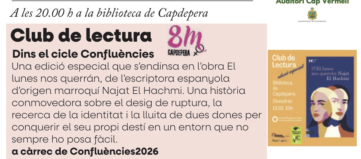Club de Lectura dins el Cicle Confluències 00 dies 00 hores 00 minuts 00 segons Data març 13 2026 Hora 20:00 - 22:00 Localització Biblioteca de Capdepera Categoria Taller Comparteix aquest esdeveniment
