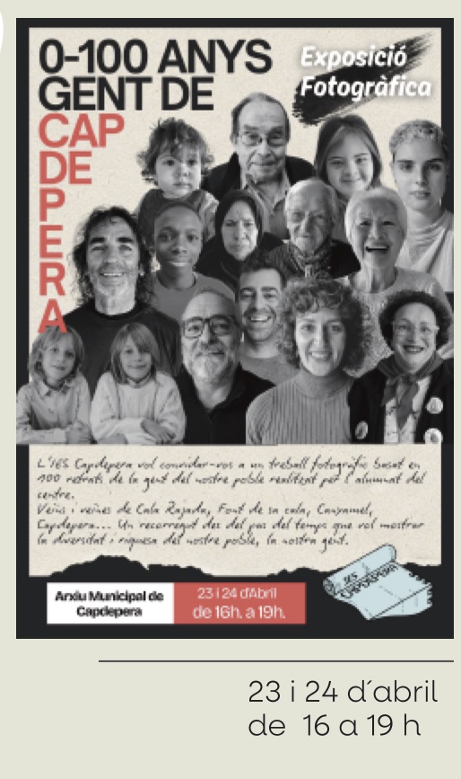 Exposició: 0-100 anys de gent de Capdepera 00 dies 00 hores 00 minuts 00 segons Data abr. 23 2026 Hora 16:00 - 19:00 Localització Arxiu Municipal Carrer Ciutat Categoria Altres Comparteix aquest esdeveniment