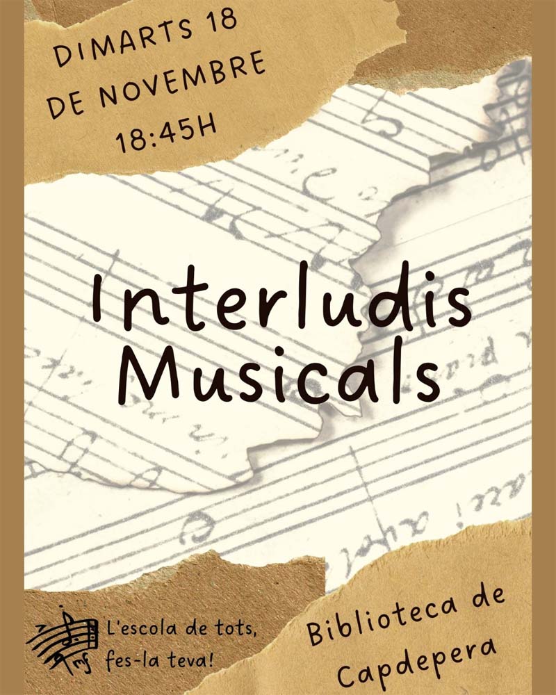 Interludis musicals a la biblioteca de Capdepera 00 dies 00 hores 00 minuts 00 segons Data nov. 18 2025 Hora 18:45 - 19:30 Comparteix aquest esdeveniment