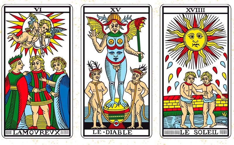 Aquesta triada de Tarot analitza L’Enamorat (VI), El Diable (XV) i El Sol (XVIIII): un recorregut des de la cruïlla de l’anhel personal cap a la síntesi de les pulsions, que culmina en la claredat de l’ésser. La dinàmica