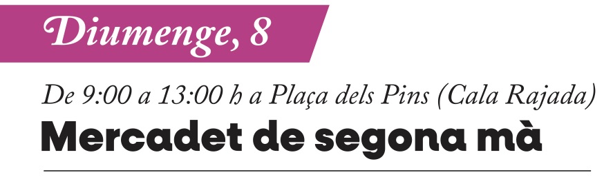 Mercadet de segona mà 00 dies 00 hores 00 minuts 00 segons Data març 08 - 31 2026 Hora 09:00 - 13:00 Localització Plaça dels Pins Capdepera Categoria Altres Comparteix aquest esdeveniment