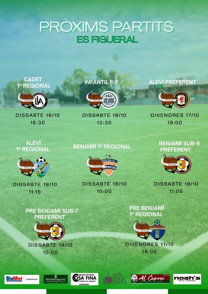 partits futbol ESCOLAR Data oct. 18 2025 Caducat! Hora 08:00 - 08:00 Categoria Esports Comparteix aquest esdeveniment