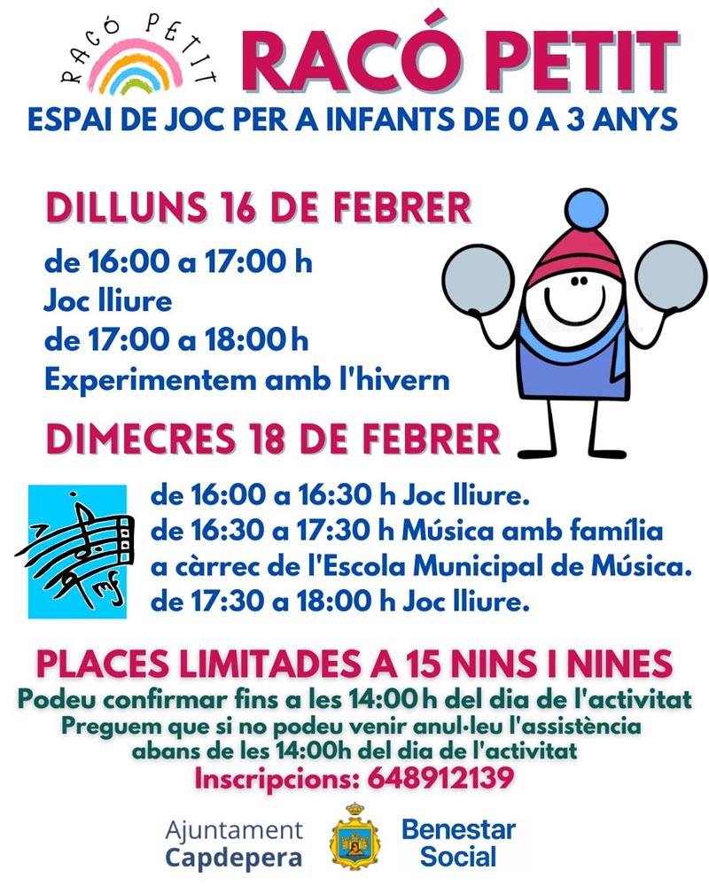 Racó Petit/Activiats 16 i 18 de febrer 2026 00 dies 00 hores 00 minuts 00 segons Data febr. 18 2026 Hora 16:00 - 19:00 Comparteix aquest esdeveniment
