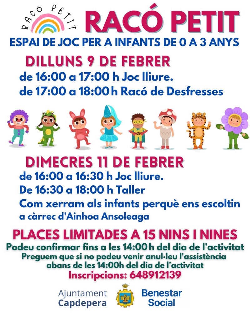 Racó Petit / Activitats 9 febrer 2025 00 dies 00 hores 00 minuts 00 segons Data febr. 09 2026 Hora 16:00 - 18:00 Comparteix aquest esdeveniment