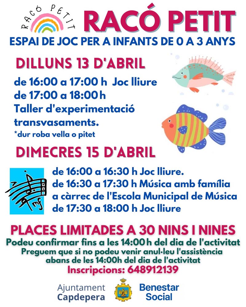 Racó petit / Dilluns 13 i 15 d’abril 00 dies 00 hores 00 minuts 00 segons Data abr. 13 - 14 2026 Hora 16:00 - 18:00 Comparteix aquest esdeveniment