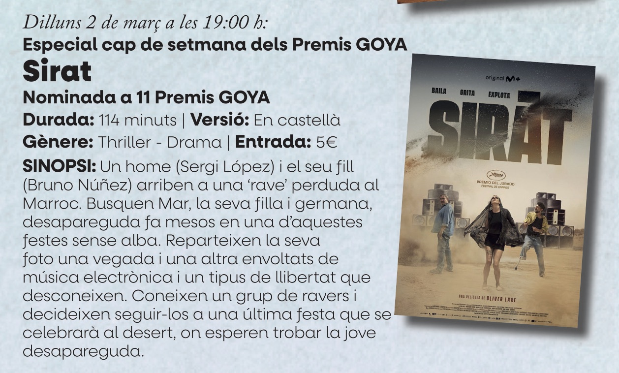 «Sirat» al Cinema 00 dies 00 hores 00 minuts 00 segons Data març 02 2026 Hora 19:00 - 21:00 Categoria Cinema Comparteix aquest esdeveniment