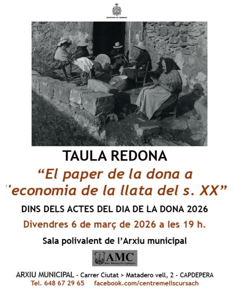 Taula rodona a l’Arxiu Municipal “El paper de la dona a l’economia de llata del s. XX” 00 dies 00 hores 00 minuts 00 segons Data març 06 2026 Hora 19:00 - 21:00 Comparteix aquest esdeveniment
