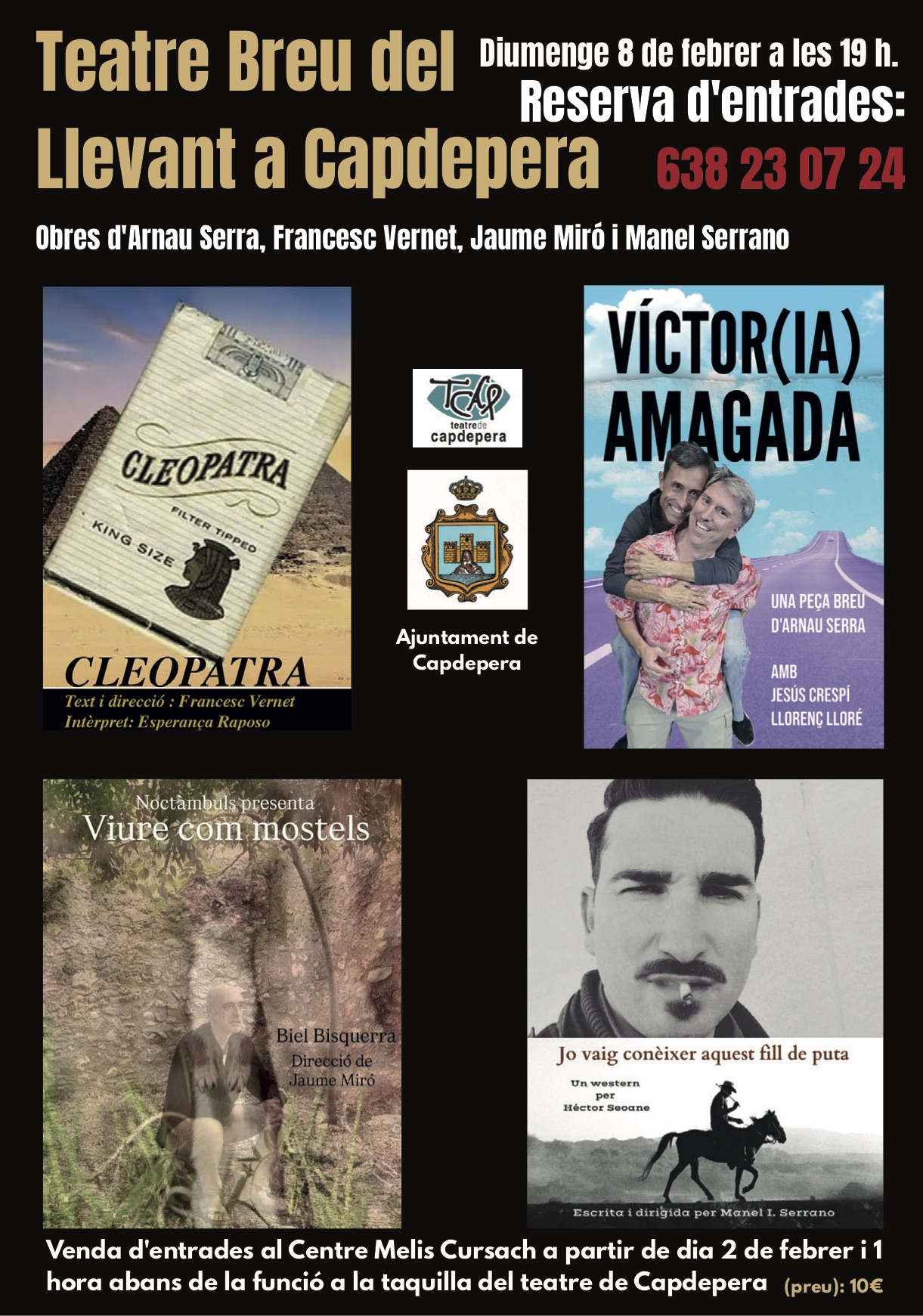 Teatre Breu del Llevant a Capdepera 00 dies 00 hores 00 minuts 00 segons Data febr. 08 2026 Hora 19:00 - 21:00 Localització Teatre Municipal de Capdepera Carrer des Col·legi, 18, 07580 Capdepera, Illes Balears Categoria Teatre Comparteix aquest esdeveniment