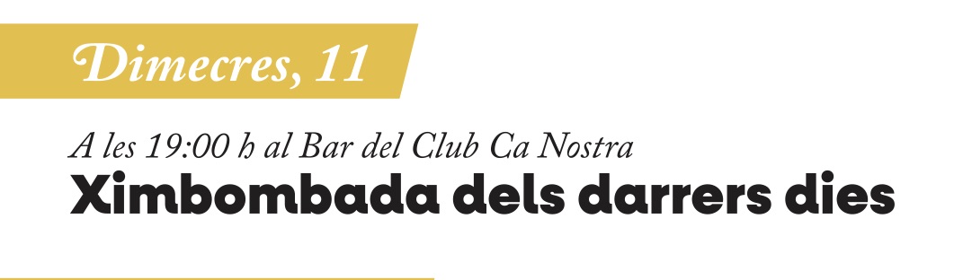 Ximbombada al Club Ca Nostra 00 dies 00 hores 00 minuts 00 segons Data febr. 11 2026 Hora 19:00 - 21:00 Localització Club Ca Nostra Categoria Música Comparteix aquest esdeveniment