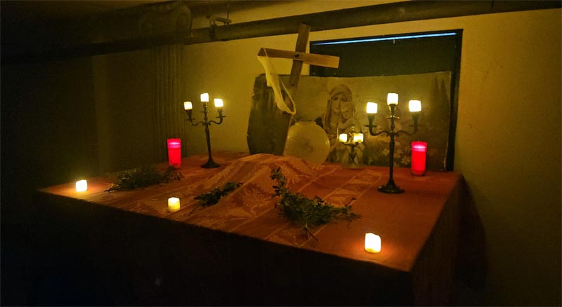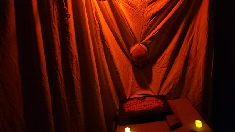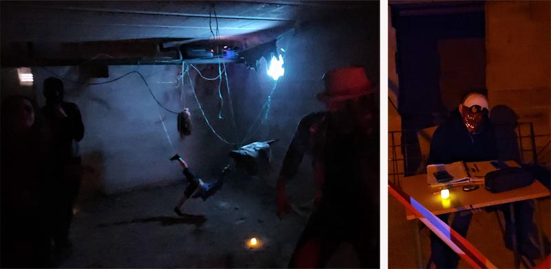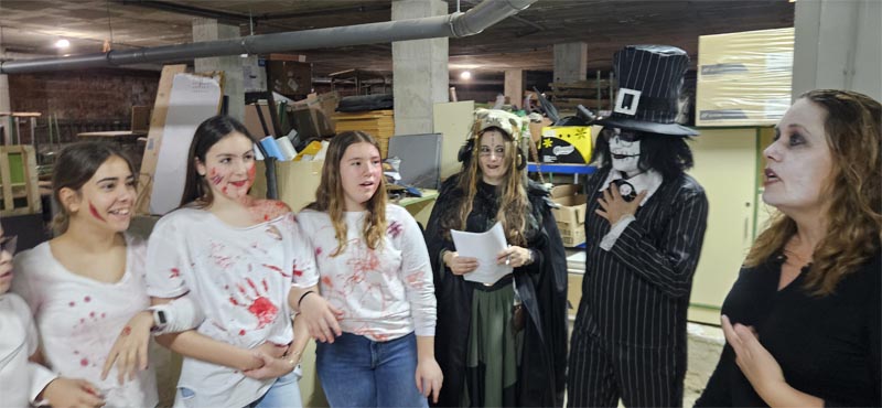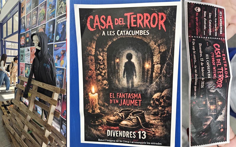 Però el més destacable va ser un recorregut pel soterrani del centre com un túnel de la por. Abans l’alumnat havia d’aconseguir la seva entrada i en grups reduïts (de 5 en 5), i protegits amb casc i advertits que la visita els podria impressionar, anaven entrant en una zona obscura. El recorregut passava per diverses sales amb elements propis de les pel·lícules de por, amb efectes molt ben encertats i una ambientació molt inquietant.