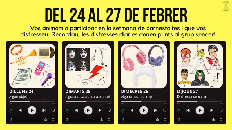 Enguany el Carnaval de l’IES Capdepera ha estat dedicat a la Música. Durant la setmana del 24 al 27 de febrer, els alumnes han estat convidats a complir una consigna en arribar a l’institut. Així dia 24 havien de dir un objecte relacionat amb la música; dia 25, s’havien de decorar amb alguna cosa la cara o el coll; dia 26, havien de dur una cosa al cap; i dijous tocava fer la desfilada amb la disfressa completa.