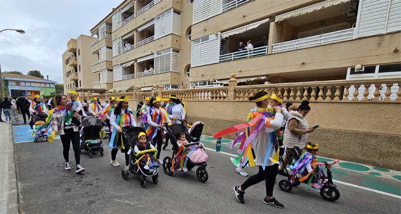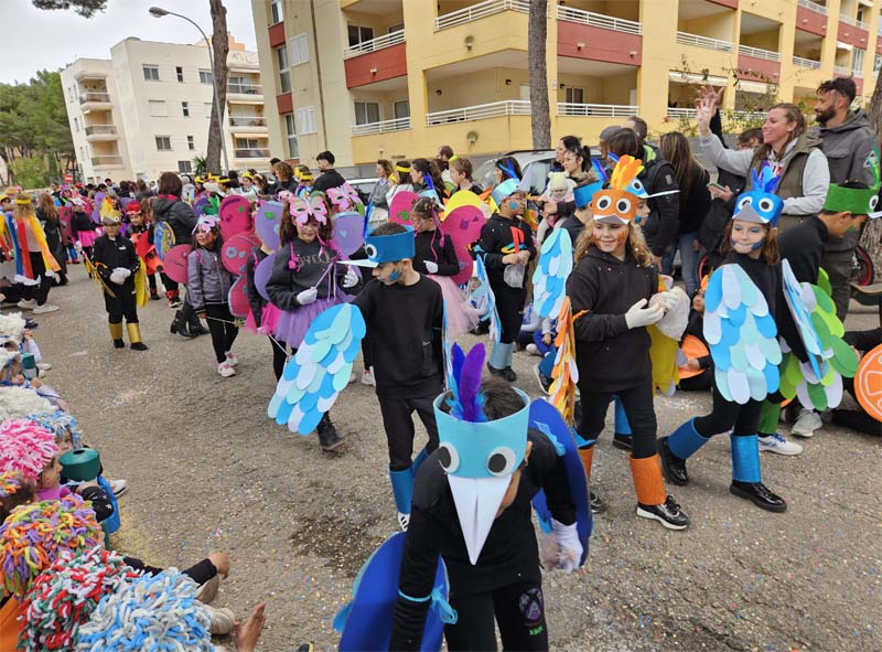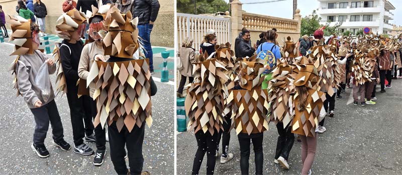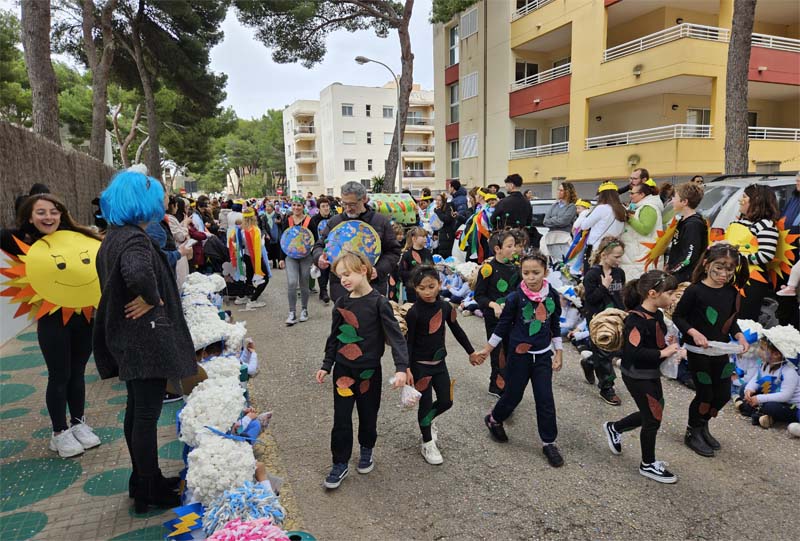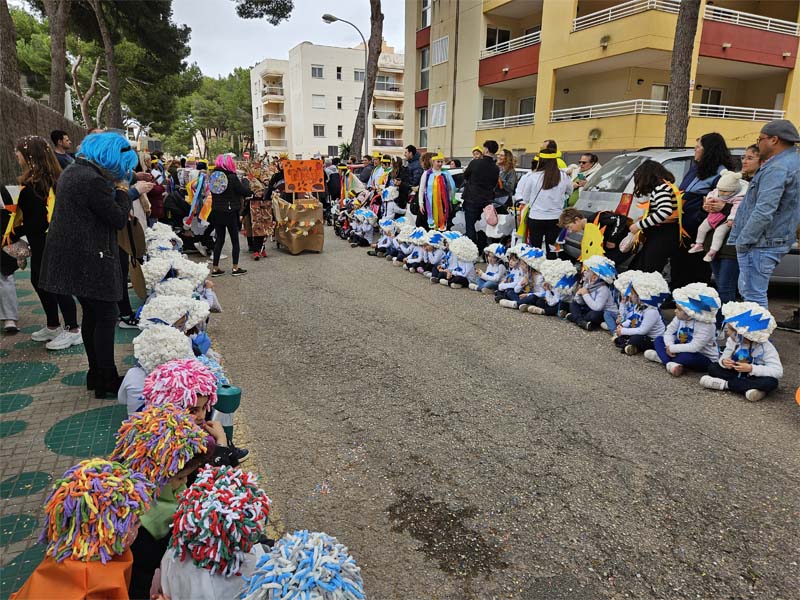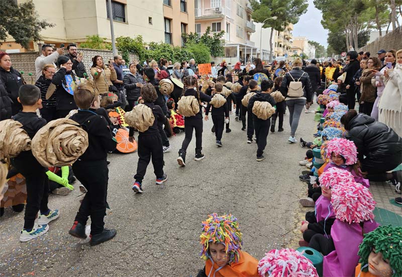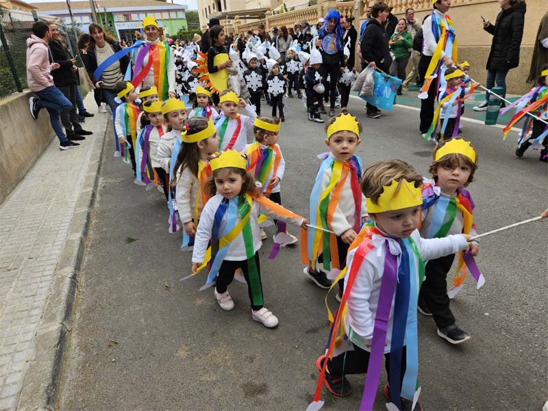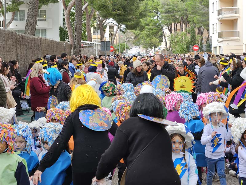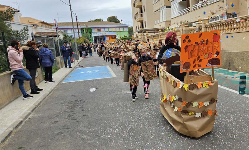 Com és habitual davant de la rueta han marxat els infantons de l’escoleta Eriçons acompanyat de pares i mares i el professorat, i seguidament l’alumnat de s’Auba per cursos, primer Infantil i després els de Primària. Com hem comentat les disfresses anàvem ordenades per estacions i davant de cada una, a més del cartell indicatiu duien música ballable.