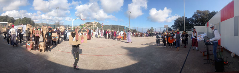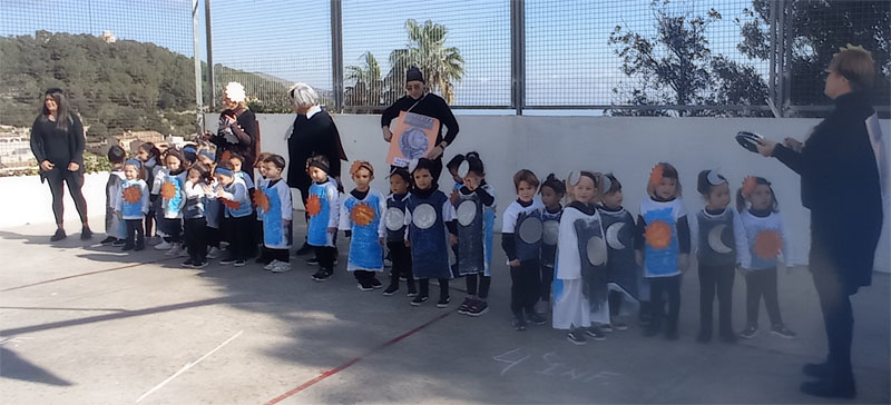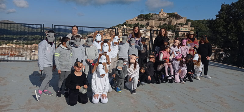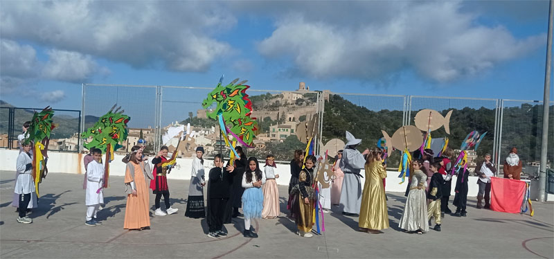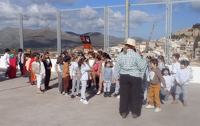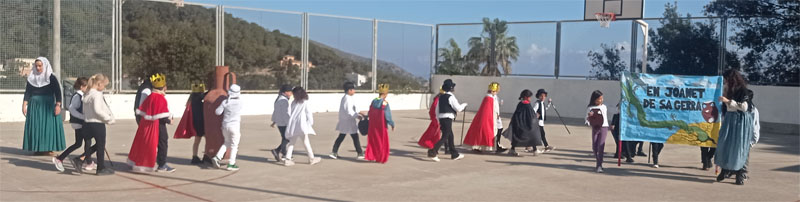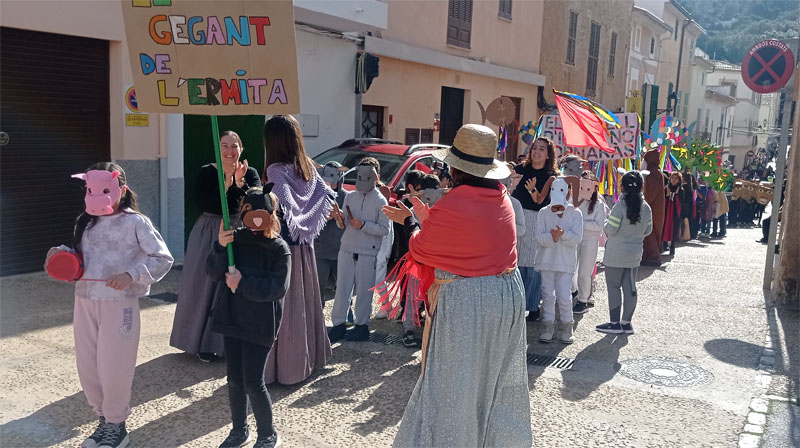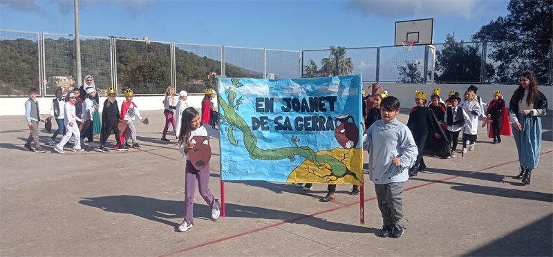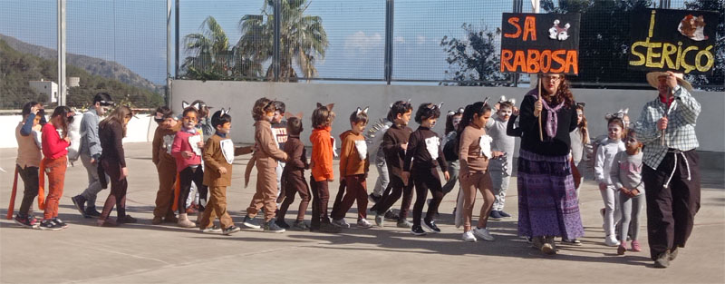 La primera en sortir (devers les 11 hores) al carrer ha estat la rueta de s’Alzinar amb la temàtica de les “Rondalles mallorquines”. Cada curs ha triat una rondalla i les disfresses han girat al voltant dels personatges que hi surten. El fill del Sol i la Lluna, EN Vit, La flor romanial, El gegant de s’ermita, Sa Rabosa i s’eriçó, En Joanet de sa gerra, El castell d’iràs i no tornaràs, etc… Els infants (i mares i pares) de l’escoleta Es Ferreret han participat i les seves disfresses han reproduït portades de rondalles amb diversos colors.