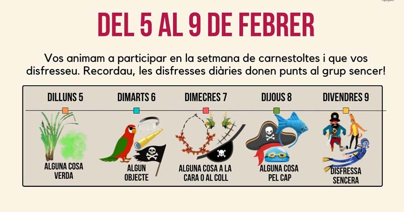 La setmana de Setmana de Carnestoltes se viu d’una forma especial als centres educatius, amb la visita del Rei Carnestoltes a les aules demanant que els nins i nines que duguin ara un mocador, o una peça de roba o un capell… fins que el darrer dia es disfressin per complet.
