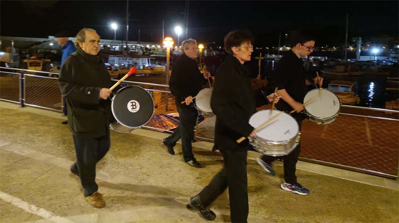 La comitiva de rigorós dol es congregà al moll de Cala Rajada per acompanyar en processó pels carrers Gabriel Roca i Elionor Server, fins la seu del club, on na Mónica Viejo va ser l’encarregada de llegir el text al·lusiu. La banda de cornetes i tambors, molt reduïda, va posar l’acompanyament musical.