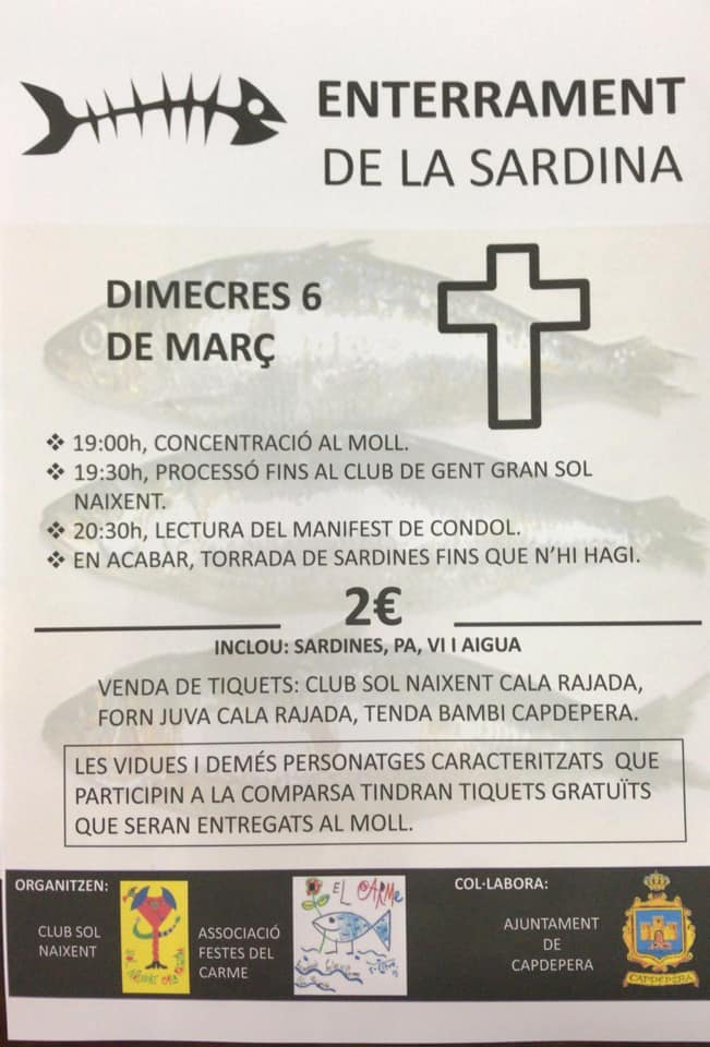 L’associació festes del Carme i la de gent gran SOL NAIXENT tornen a recuperar l’enterrament de la sardina com a punt i final de les festes del Carnaval. L’enterrament de la sardina se celebra el Dimecres de Cendra, primer dia de Quaresma. S’an acabat les festes de la carn i ja sols ens queda la raspa de la sardina durant 40 dies.