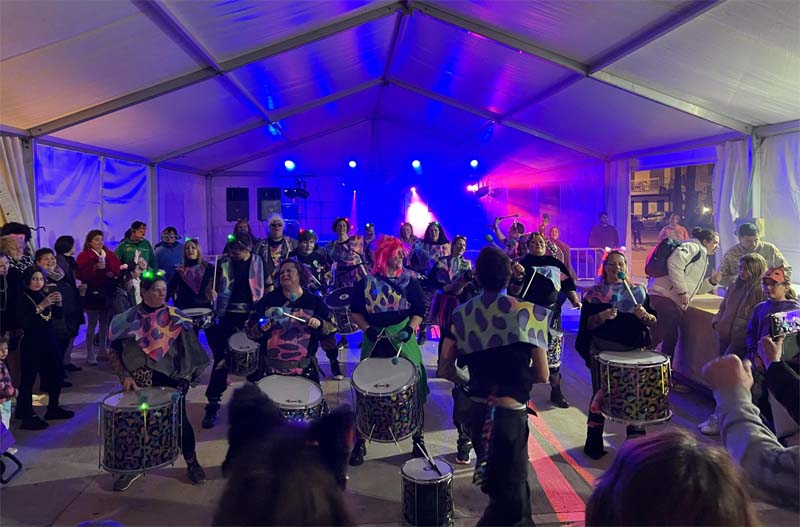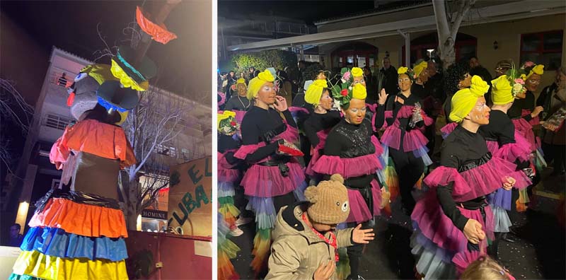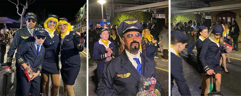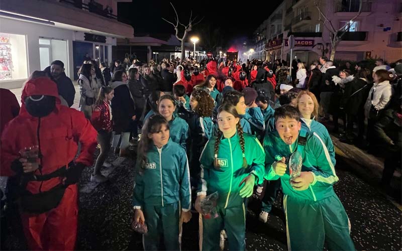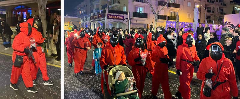 Però encara hi havia més comparses, com la del “Joc del calamar”, amb els dos tipus de personatges jugadors (joves) i controladors (adults), i música de la famosa sèrie; o dos avions individuals (pare i fill) molt graciosos; o els esquiadors amb tabla de neu; i per tancar una comparsa que representava un matrimoni reial.
