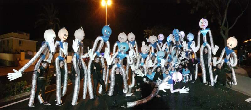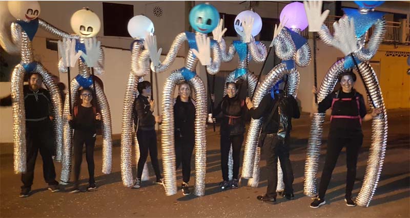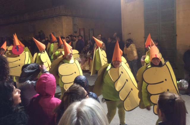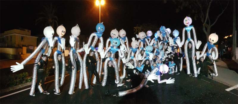 Seguidament, començaren a davallar des de can Patilla les carrosses, amb l’avançament de la Batucap, que anava de vikinga i feia sonar els tambors amb el retruny solemne de tot un exèrcit de piarrots. Després, varen venir els disfressats de “Som aquí gabellins”, que estrenaven logo de Gustavo, vestits d’un agradable color groc, que afavoria l’ambient festiu; originals també foren els robots, uns com a titelles aèries amb molles com a braços i cames; i altres com a caixes quadrades, petites que lluïen un color platejat. La màgia de la nit esdevenia còmplice de les fresses. Vengueren també els renouers de La casa de papel, amb bona música, però que deixaven el carrer massa empaperat amb el seu repartiment fictici de bitllets. Ens cansàrem també de veure el gimnàs dels 80, amb una música de Fama que feia que els més joves es tombassin enmig del carrer per fer un bon estirament de cames. A més, les carrosses de ball es repetien. Hi hagué també un dinosaure, amb els caçadors fressats de camuflatge. També hi hagué una comparsa molt original d’ocells, de llustrosos colors verd i groc.