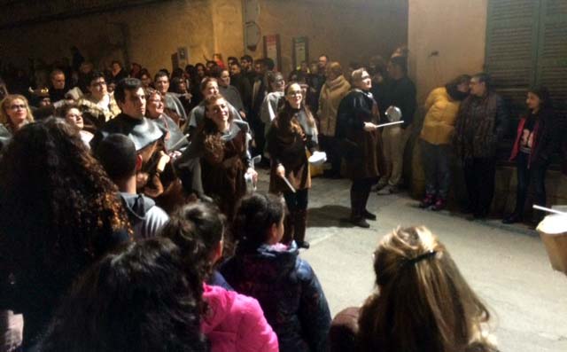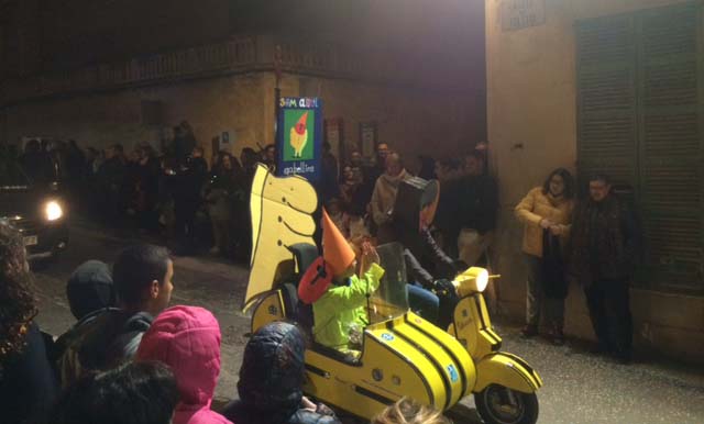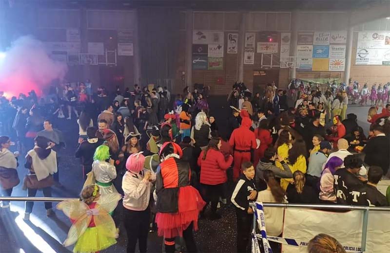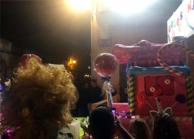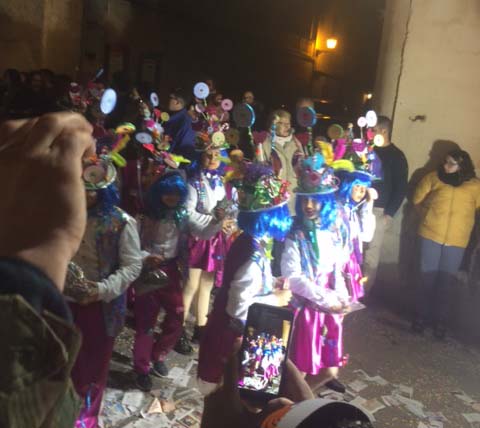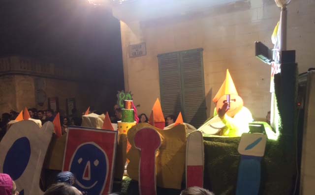 Posteriorment, les carrosses davallaren pel carrer Col·legi. Les famílies i amistats estaven a la vora de les seves cases, a les aceres o al cafès per veure passar la rua, que anava ballant sota el pes de la música, animada i festiva, discotequera i moderna que feia que l’instant fos més feliç i agradable, fins arribar a l’autovia, la policia local y protecció civil, acompanyà en tot moment el recorregut, que tombà a l’esquerra cap al poliesportiu, mentre la gent somreia i encoratjava les comparses, que ballaven sense aturall. Aturaren entre el polisportiu i l’Institut.