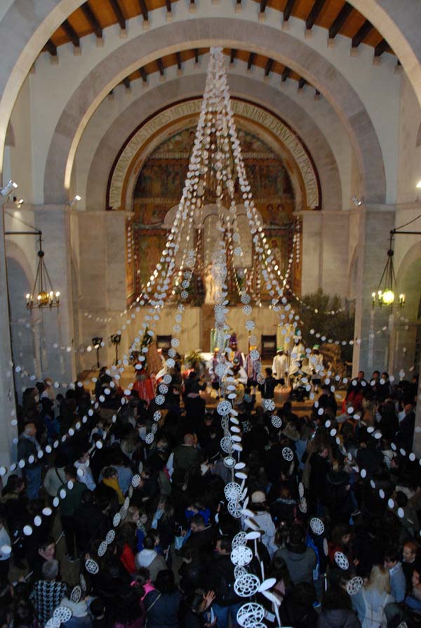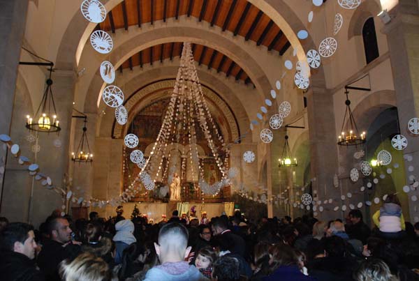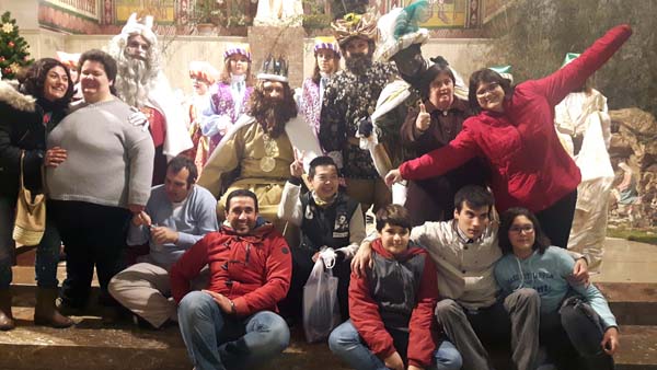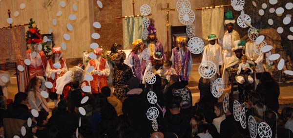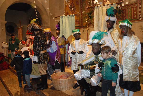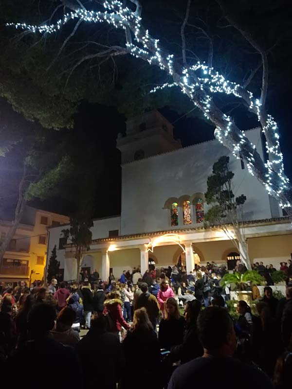 Muntats en les respectives carrosses, es dirigiren a l’església, on repicaren les campanes i s’organitzaren tres fileres de nins, una per cada Rei, per tal d’agilitzar les salutacions individuals, això que fa tan propers i entranyables el Reis a Capdepera. Entre els que s’hi aproparen hi van ser el grup de Som Aquí Gabellins, tan il·lusionats com els que més.