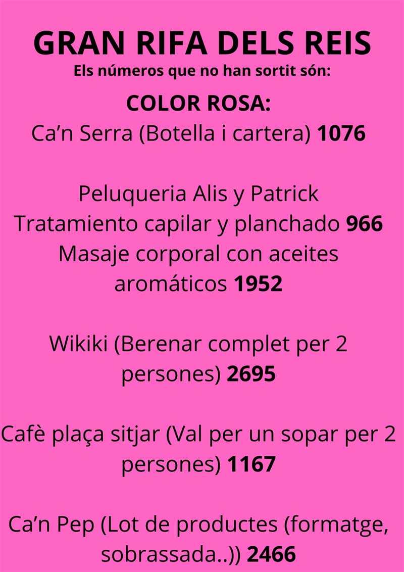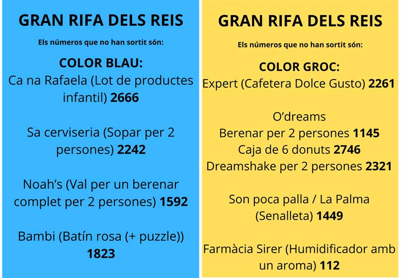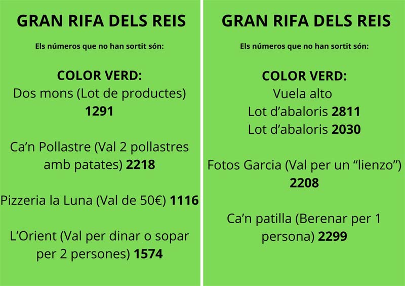 Nombres premiats que no han recollit els obsequis. Aquests són els nombres dels premis de la Gran Rifa dels Reis, que no han estat recollits: Altres articles Capdepera comptarà amb quinze nous habitatges de protecció oficial 2 de desembre de 2025 Defuncions: JOSÉ NIETO MORENO 26 de novembre de 2025 Concert de Santa Cecília 2025 30 de novembre de 2025 Carta a Cap Vermell: una altra mostra d’incivisme a prop del Claper des Gegants 8 de desembre de 2025 Cròniques de bàsquet 2025-26. Cap de setmana 28, 29 i 30 de novembre de 2025 5 de desembre de 2025 Capdepera rep la Bandera Verda d’Ecovidrio 19 de novembre de 2025