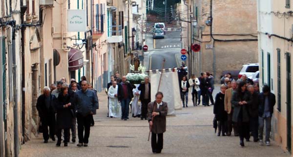 Ja al capvespre, la processó, que enguany ens va semblar una mica més concorreguda que en anys passats, amb la imatge de la Verge de l’Esperança “de baix”, va efectuar el seu tradicional recorregut d’anada i tornada de l’església de Sant Bartomeu al Castell. L’acompanyà, i això tampoc passa cada any, la Banda de Música, tocant les Avemaries. La processó va estar presidida pel rector Antoni Amorós, acompanyat per Mn. Pere Orpi i fra Miquel Fornés.