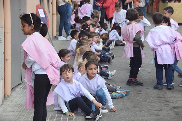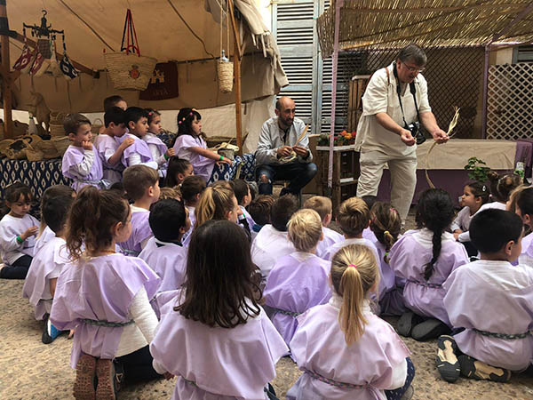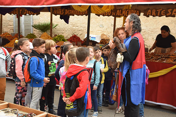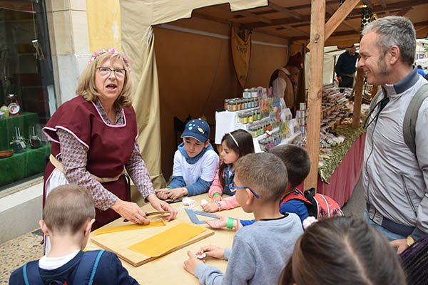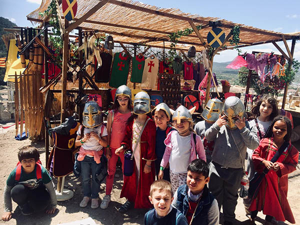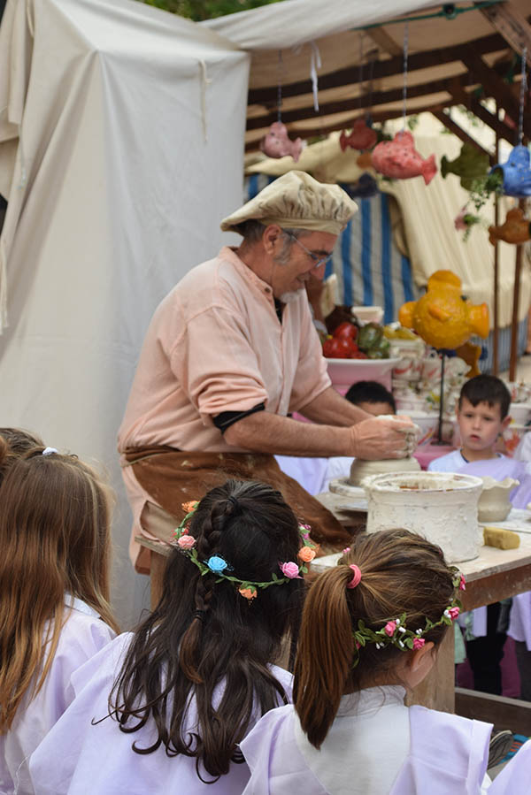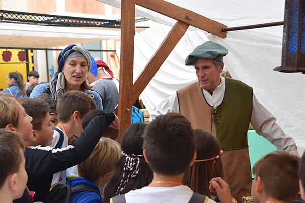 El Mercat Medieval, amb vint anys a les esquenes, té assolits uns rituals que el caracteritzen. Un d’ells, i possiblement el més bell i exclusiu (no coneixem altra fira que dediquin una jornada als escolars) és la visita el divendres matí al mercat. I no és una visita qualsevol. És una visita per a fer feina, posar-hi les mans, colcar a cavall, fer-se el pa amb oli, tastar les neules o els bunyols, ballar, veure acrobàcies, tocar una serp gegant, fer fang amb un torn, siurells, ciris, monedes, obra de pauma,.. Unes experiències que, possiblement, no oblidaran en molts d’anys, i que fan que formin part de la seva identitat com a poble.