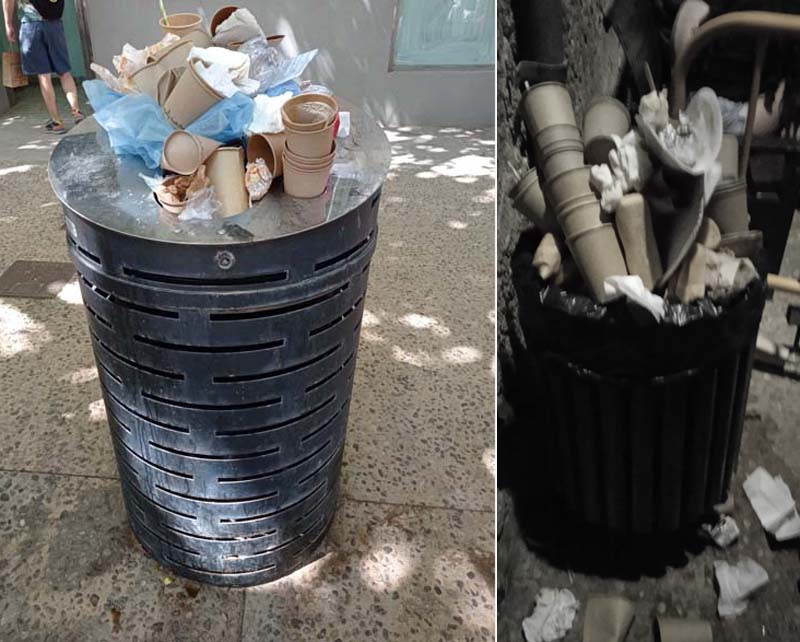 Alguns firaires i visitants ens comentaren que les papereres no donaven l’abast. Molta brutor no la vam veure, de fet sempre trobàrem qui llença en terra papers o tassons usats, però les papereres sí que es veien desbordades i no donaven bona imatge. Podria augmentar la freqüència de recollida en els punts més “calents” del Mercat i a les hores de màxima afluència de públic. I l’ús de tassons d’un sol ús augmenta notablement el volum de residus.