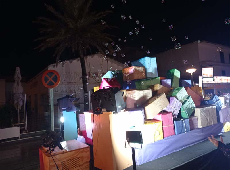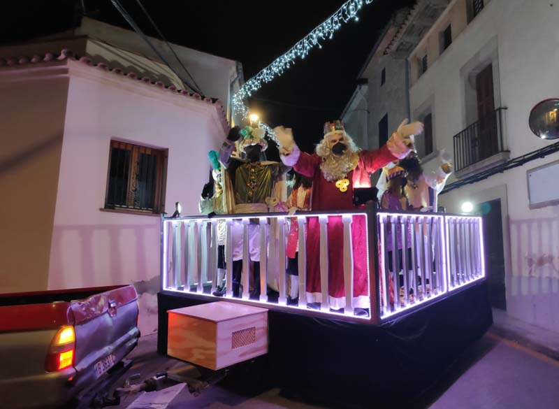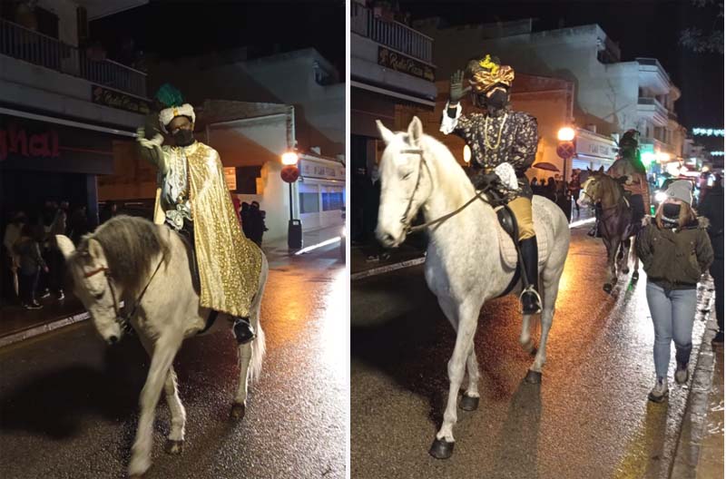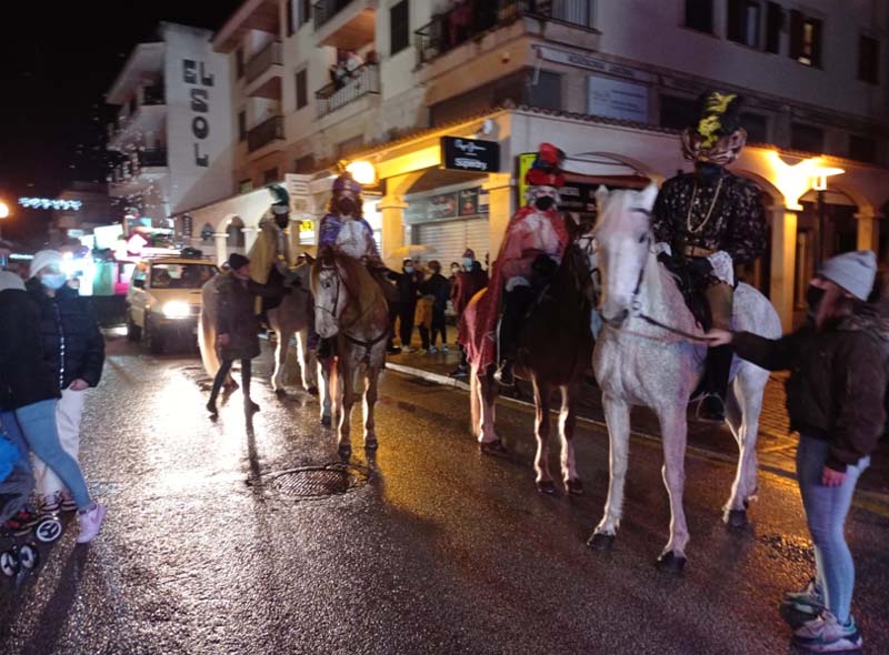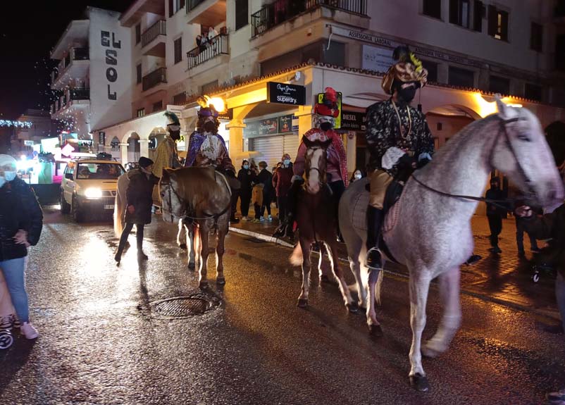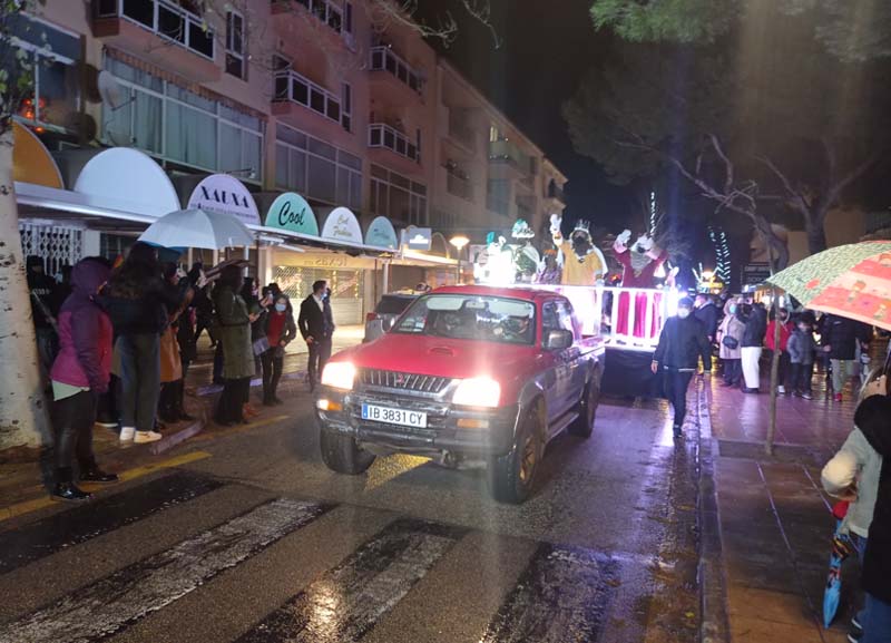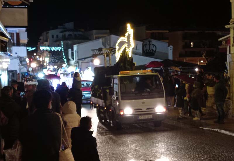 Com estava previst, amb cert retràs, la carrossa dels Reis (anaven tots a la mateixa) acompanyada de l’estrella de Nadal, els patges a cavall i un camió ple de regals, van sortir des de Cala Gat i seguiren tot el carrer Elionor Servera fins l’autovia. Una gran quantitat d’infants i pares, malgrat el plugim i fred que feia, van compareixer a les voreres per seguir el passacarrers.