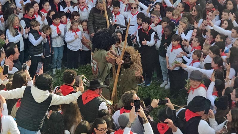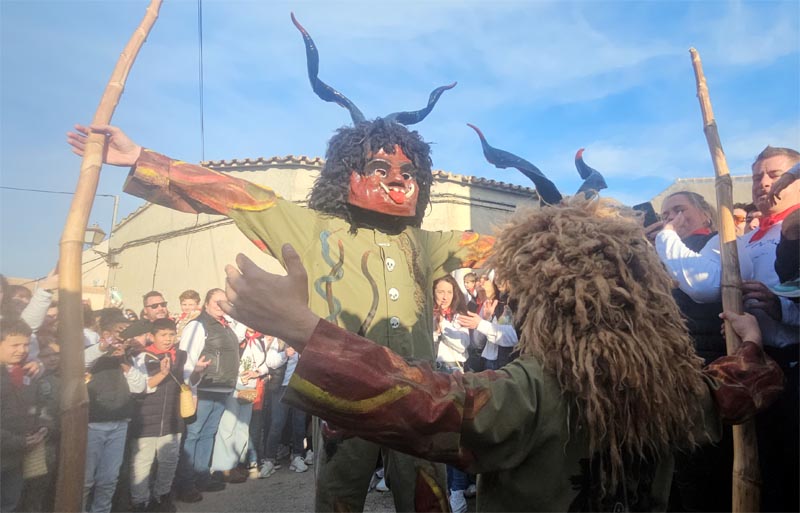 A partir d’aquí s’inicià el recorregut darrere el dimoni cap a la plaça de l’església, ja plena a vessar Amb dificultat els obrers aconseguiren fer un estret passadís per permetre el pas dels components de la Banda i de l’encontre dels dos dimonis per a fer el primer ball conjunt.