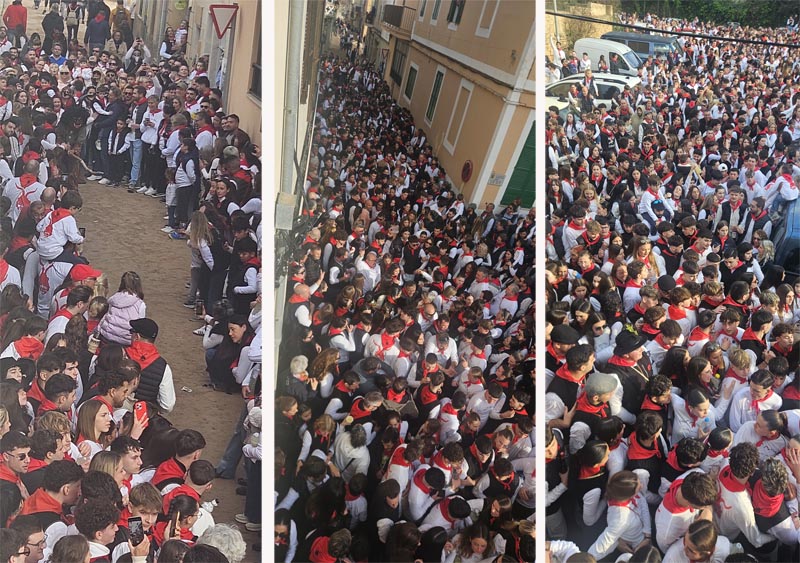 Després de la repicada de campanes es començà a congregar la gent, la majoria vestits amb camisa (o camiseta) blanca i mocador vermell al coll.