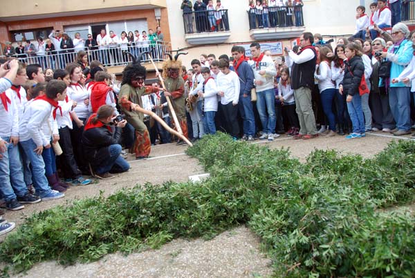 Puntualment, el dimoni sortí de la cotxeria de can Toni Moll, on la gentada esperava l’inici de els corregudes. Després, la comitiva es dirigí cap la plaça de l’Església, on esperava el dimoni ros per a escenificar la trobada i rompre la creu de mata.