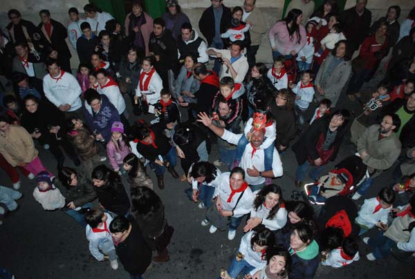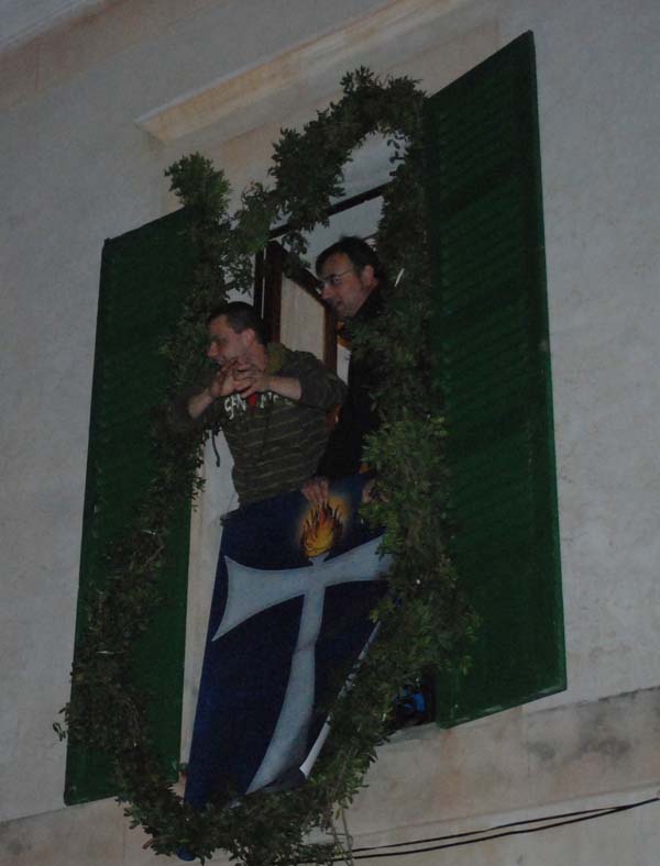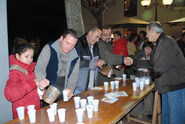 A les 7 en punt, la plaça de l’Orient ja era plena de gom a gom de santantoniers de totes les edats que, després d’escoltar les paraules de benvinguda del president de l’Obreria, realitzaren un recorregut pels carrers del poble, fins a la casa de l’Obrer Major, Tomeu Melis. Allà se sentiren les primeres cançons i els crits de “Visca Sant Antoni”, mentre es penjava el rest de mata en el balcó i es desplegava la bandera de Sant Antoni. Tornats a la plaça de l’Orient, se serví una bona xocolata calenta i vinet per a encalentir el cos… i l’esperit.