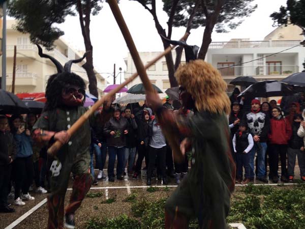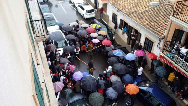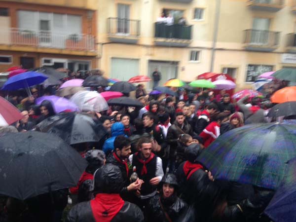 Plovia de forma intermitent, i malgrat tot se decidí fer una volta més senzilla, amb el ball inicial, corregudes fins la plaça de l’església i la trobada dels dimonis. Mentre un bon grup d’incondicionals santantoniers acompanyà els dimonis i cantaren i ballaren sota la pluja.