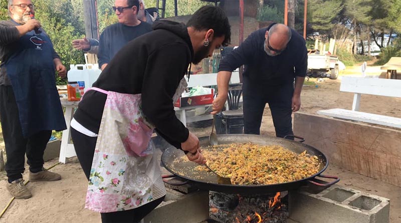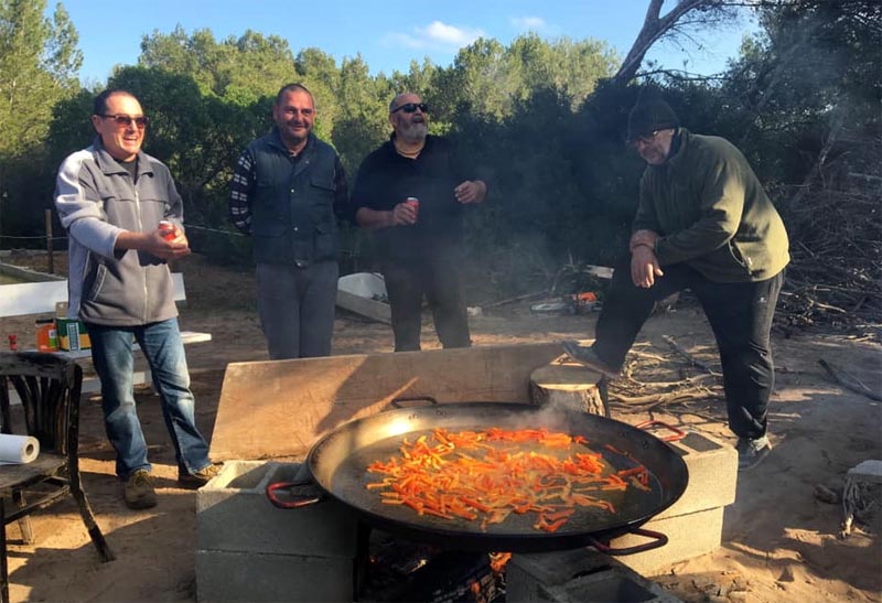 Aquestes imatges de dimonis, obrers i amics, preparant estris, fent el carro net, tallant i anuant la mata… I com no una bona paella per ajuntar tots a taula.