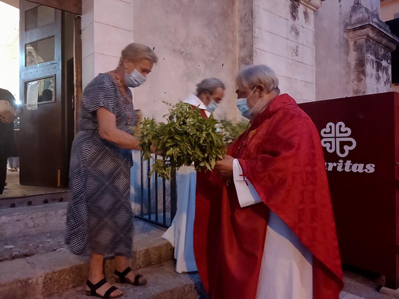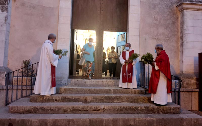 En acabar, i seguint el costum, els concelebrants saludaren els presents a la sortida de l’església i els oferiren una branqueta d’alfabeguera, aquest any, sense passar davant de la imatge de Sant Bartomeu, presidint en tot moment l’Ofici.