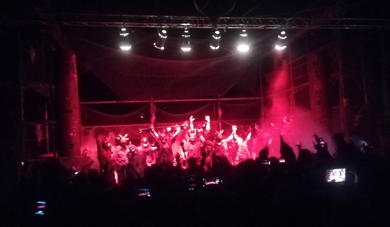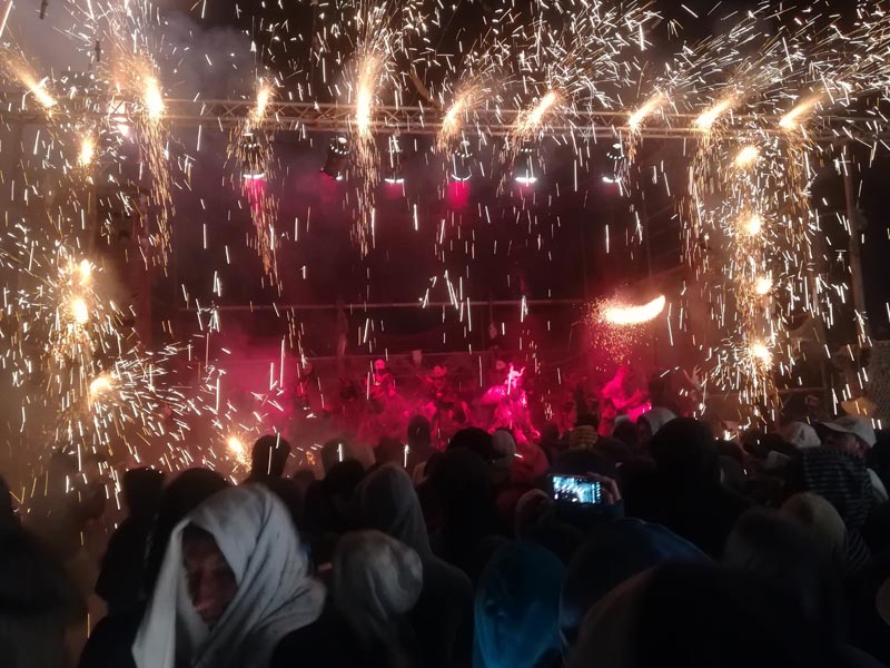 El final de festa va ser impressionant amb la plaça plena de gom a gom i dimonis per tots els costats. L’actuació acabà amb l’escenari ple de dimonis ballant al son de la percussió i els focs d’artifici.