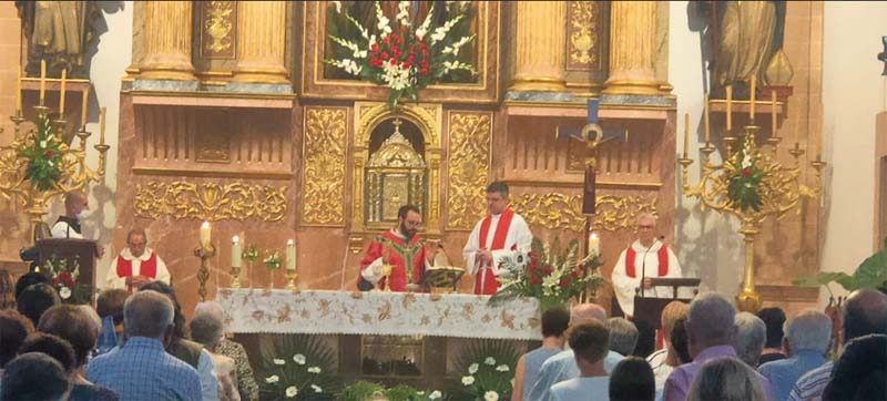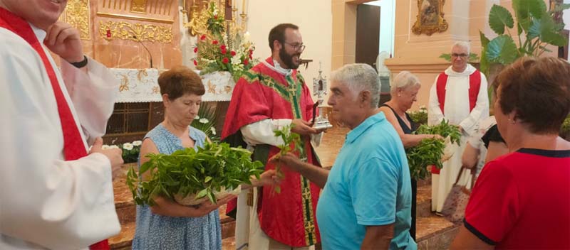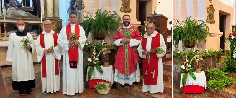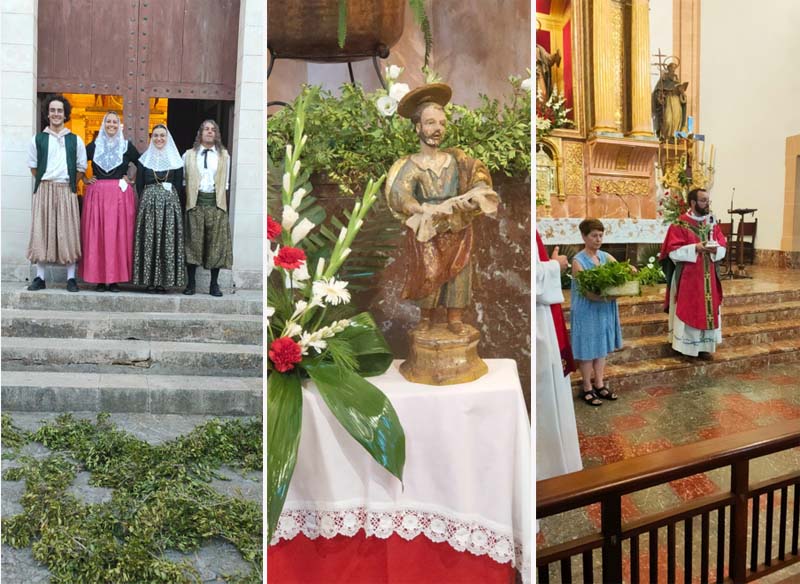 Un Ofici de Sant Bartomeu, que amb motiu de caure en dia feiner, va tenir la presència d’altres preveres convidats pel senyor rector. Oficià i presidí la cerimònia Mn. Baltasar Morell Fuster, rector d’Artà, Sa Colònia de Sant Pere, Cala Millor i Sa Coma. Concelebraren amb ell, el rector de la Parròquia de Capdepera, Mn. Xisco Bernabeu i els preveres fills del poble, Mn. Nadal Bernat Sales i Mn. Pere Orpí Ferrer (capellà ja jubilat). Una imatge de l’altar ple de capellans, que ja feia temps que no es veia, tot sigui dit, bona part de culpa la té la COVID i les mesures de seguretat imposades als darrers anys. Com és costum en les cerimònies dels Sants Patrons, els capellans vestien de color vermell, i també com es costum, a l’entrada de l’església, a la plaça davant l’escala s’escamparen els brots de mata en senyal de solemnitat. A l’interior, presidí l’Ofici la talla de la imatge de Sant Bartomeu.