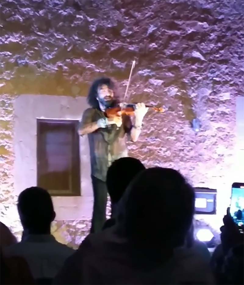 Posteriorment, el violí de Malikian tremolava a cada instant, amb la força magistral de les cançons populars, però també amb la embriaguesa de la música clàssica. Va ser impressionant, el silenci entre nota i nota i com el violí agafava velocitat davant d’un públic entregat i un cel estrellat des d’una torre del segle XIII, que servia per albirar les incursions corsaries. Malikian quedava exempt de tota aquesta Història, que es va equivocar mig en broma, mig seriosament, amb el nom de la torre, que arribà a dir «torre de Campamel». Els dits del veterà intèrpret semblaven que volassin a damunt l’instrument i l’acompanyament al piano era del tot adient. No bastaren els aplaudiments que va saber arrabassar de l’auditori per acabar d’omplir un recital gairebé perfecte. En el capítol destinat a les versions, el músic libanès es decantà per «La campanella» d’un dels seus músics preferits: Nicolo Paganini, de qui contà que va ser un jugador que un dia en unes messions perdé el violí. De l’orquestra un jove músic n’hi deixà un per cortesia, però tenia una corda amb una nota que no sonava com calia; a partir d’aquella nota decidí composar una peça que seria la que Ara interpretà en acompanyament simpàtic d’una petita campaneta sonada per Melón. Després versionà un altre dels grans, ni més ni manco que Chaicovski, amb la broma que el ballarí que sortiria a l’escenari seria el mateix Melón, format suposadament a les escoles de dansa de Cuba, fet que el pianista encaixà amb una ampla rialla.