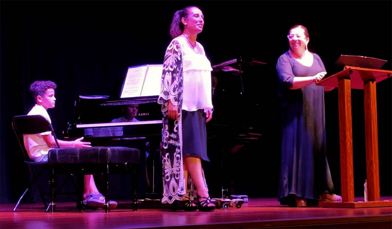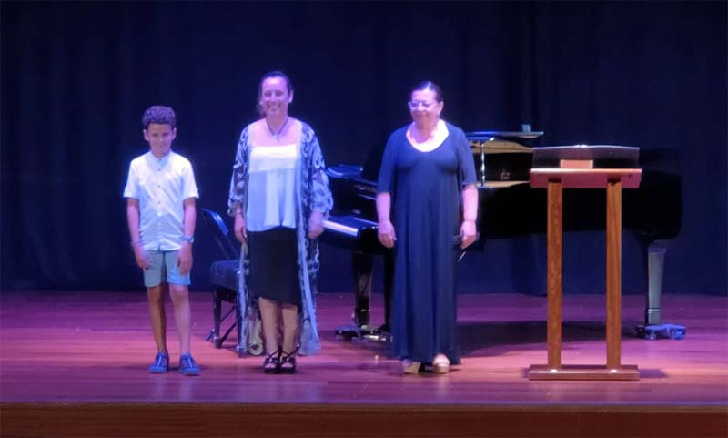Seguidament, una vegada assegut el públic en les cadires de plàstic separades, que substituïen les butaques, el concert comencà, en un escenari fosc i elegant, ocupat per un piano i amb una fantàstica decoració floral en un dels laterals. El públic estava impacient, perquè feia bastant de temps que no les havia escoltat. De mica en mica, la veu de Bàrbara començà des de un to més baix a encalentir i agafar força i color a mesura que començava la interpretació, mentre un jovenet girava la partitura a na Maria Antònia. La melodia del vals «Cent mille chansons» de Michel Magne, serví per començar a festejar els assistents. Com que no hi havia programa de mà, na Maria Antònia presentà les peces, amb una gràcia que connectà amb el públic.