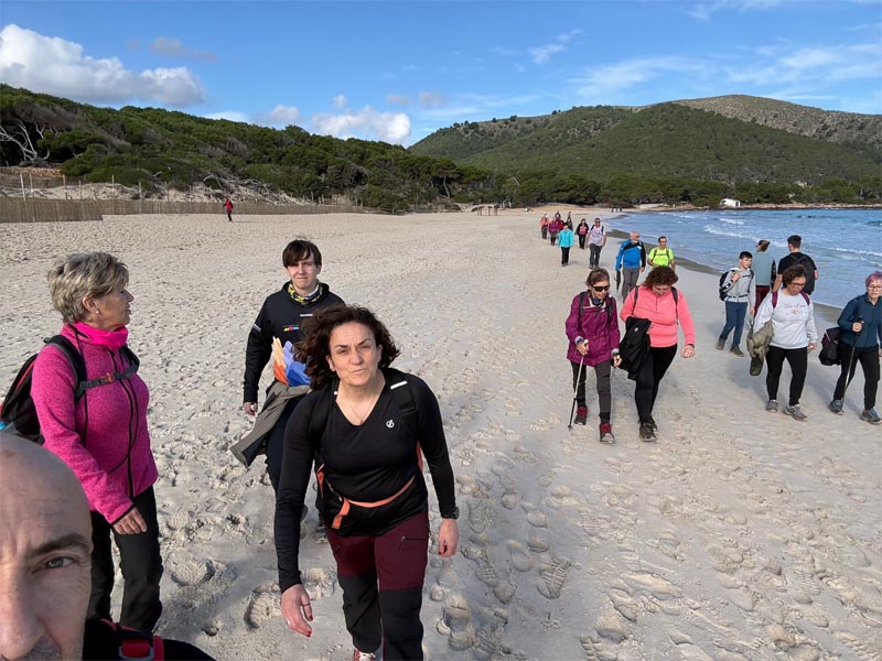 Per tornar a Cala Agulla, voltaren el puig de s’Àguila per la vessant sud, arribant al camí del coll de Marina, ja prop de la platja de Cala Moltó. Tornàrem a travessar la platja de Cala Agulla, ara amb més gent que passejava (inclús algú que nedava) i de tornada als cotxes finalitzaren la darrera caminada del grup del 2025.