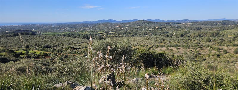 El camí ens du a una zona asfaltada, prop és la via Verda, però abans giràrem cap a l’esquerra un altra vegada (amb senyalitzacions de Panoràmik). Pujàrem suaument per la pista i, en guanyar alçada, tenim excel·lents panoràmiques de Cala Millor i la costa entre la Costa dels Pins i la punta de n’Amer. Trobàrem un grup de joves de l’IES que realitzaven una sortida escolar. Sense perdre alçada, passàrem vora unes torres de vigilància sota el penya-segat de na Penyal.