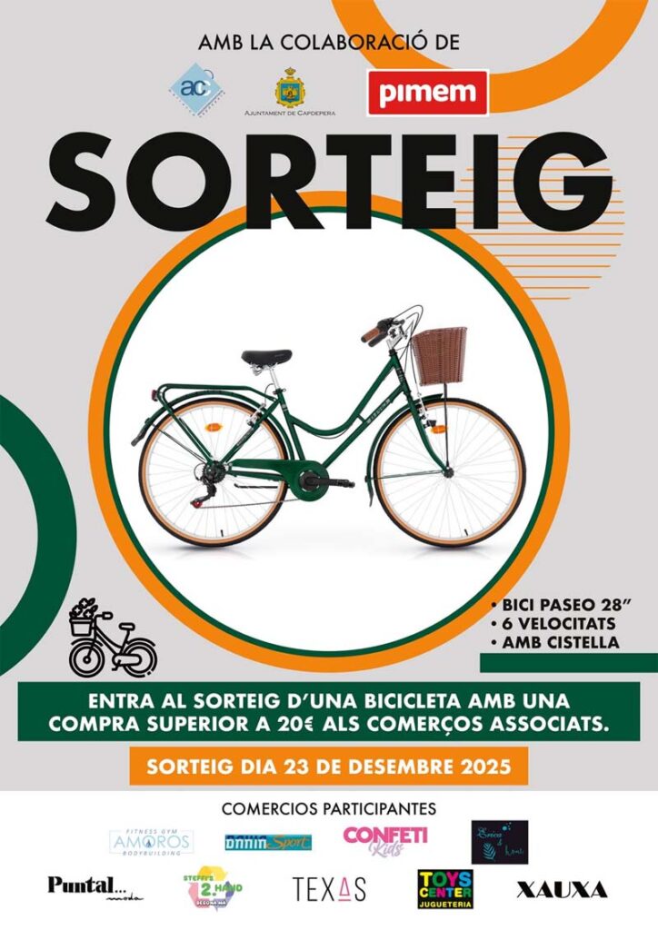 Dia 23 de desembre se celebrarà el sorteig d’una bicicleta valorada en més de 300 euros, entre els clients dels comerços del municipi adherits a la campanya de promoció. Amb una compra superior als 20 euros s’entrarà en el sorteig.