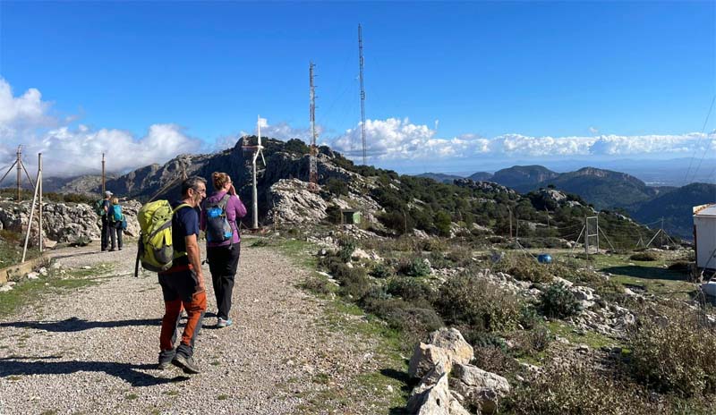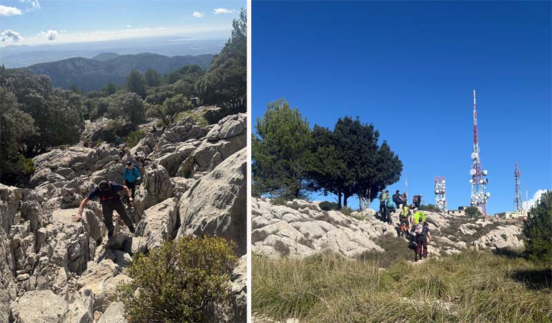 Seguidament, ens apropam a les antenes d’Alfàbia (el puig té 1067 metres sobre el nivell de la mar), on ens topam amb l’arriscada reparació d’una de les antenes més altes per part d’un dels operaris, que amb simpatia ens donà conversa. A mig camí, a devora d’una paret seca, vam fer una aturada per descansar i menjar una mica. Alguns aprofitaren per fer fotos, mentre altres gaudien del silenci i del paisatge i d’alguns rajos de sol. El temps ens va acompanyar: ni massa calor ni massa fred, ideal per caminar. Durant el recorregut, vam poder admirar les vistes espectaculars sobre la vall de Sóller i les muntanyes del voltant, amb el Puig Major i el L’Ofre com a protagonistes del paratge. També contemplàrem es Castellot, na Mamelluda, Son Vencis i ses tres Creus. El sender és bo de seguir, tot i que la davallada, humida i amb pedres per darrera la possessió i fulles sota l’alzinar el va fer força llenegadís i delicat.