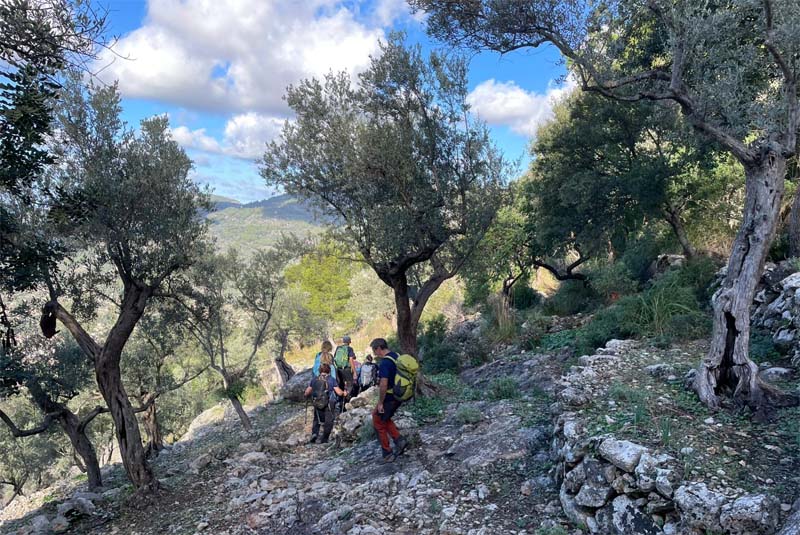 Partim des d’Orient i a mesura que anem ascendint podem gaudir en part de les vistes sobre la vall. El camí s’enfila entre oliveres centenàries, parets de pedra seca i comellars ombrívols. La pujada cap al pas des Mart es va fer molt feixuga, amb fortes i angostes pendents. Quan fórem a dalt, tenguérem un entrebanc no esperat: una persona ens va dir que per allà no podíem passar, perquè era propietat privada, quan en realitat no veiérem cap rètol que ho indicàs. L’espai es veu que havia estat llogat, però el guia decidí atrevidament que havíem de continuar i així ho férem. Una vegada allà tenguérem la plàcida caminada per un petit replà que ens portà a banda dreta de l’itinerari cap al pas des Mart, un singular estret de muntanya pel que passam tots per poder contemplar un paisatge excel·lent.