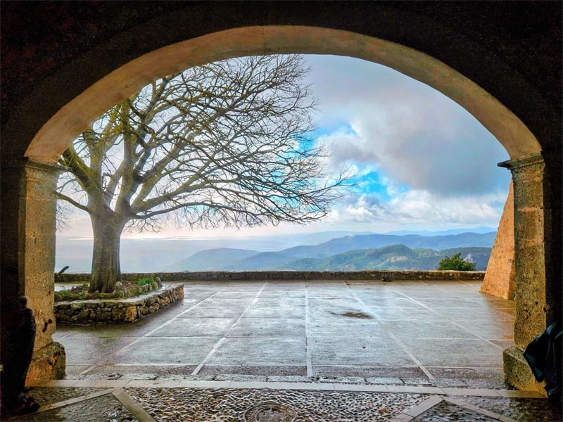 Posteriorment, arribam al castell (6,4 km) per poder dinar una mica i reprendre forces amb una xocolata o cafè. El castell d’Alaró fou construït amb finalitats militars i és un dels tres castells roquers que hi ha a Mallorca, amb el Castell del Rei a Pollença i el de Santueri a Felanitx. Declarat bé d’interès cultural BIC, ubicat al puig d’Alaró, té un fort interès històric, i un lloc idoni per contemplar la Serra de Tramuntana i el Pla de Mallorca. Ens acull l’alberg i l’Ermita de la Mare de Déu del Refugi. La primera pedra de l’oratori es col·locà l’any 1622, amb motiu d’una peregrinació per implorar la finalització d’una gran sequera. Hi destaquen les ceràmiques del terra i les decoracions de les parets. Després de visitar el lloc i gaudir de les vistes, ens feim la fotografia de grup i ens disposam a iniciar la davallada. Aquesta vegada no tornarem pel mateix lloc, sinó que aprofitarem una desviació que ens ha de portar directament fins a Alaró, travessam en ziga-zaga un camí a voltes empedrat i el grup es torna a separar. Avançam per dreceres que continuarem agafant una vegada que siguem a la carretera. Lentament, caminam per una pista que conserva taques marrons i ocres, de tant en tant abandonam la carretera i el clima és molt inestable, tant que ens fa obrir i tancar el paraigües cada vegada.